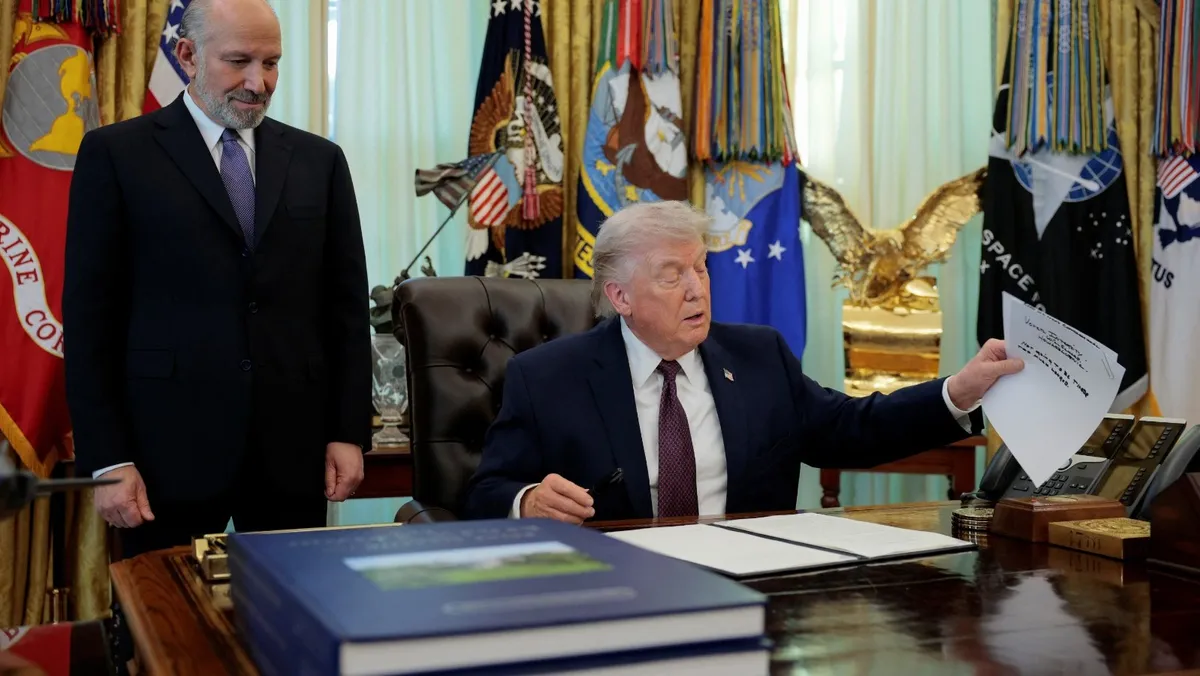 الرئيس الأميركي دونالد ترمب يتحدث بجوار وزير التجارة هوارد لوتنيك خلال مراسم توقيع أمر تنفيذي بشأن الاقتراع عبر البريد في المكتب البيضاوي بالبيت الأبيض. 31 مارس 2026 - reuters