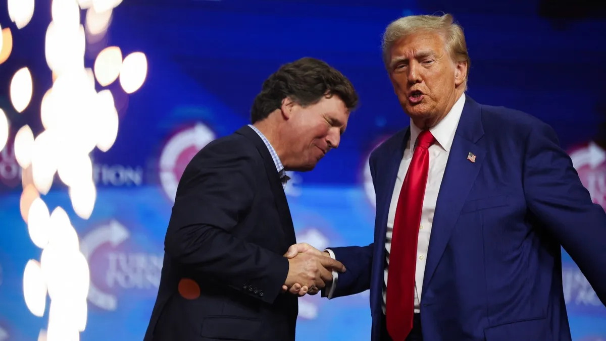 الرئيس الأميركي دونالد ترمب يصافح تاكر كارلسون في فعالية انتخابية برعاية جماعة "ترنينج بوينت يو إس إيه" المحافظة بولاية جورجيا. في 23 أكتوبر 2024 - reuters