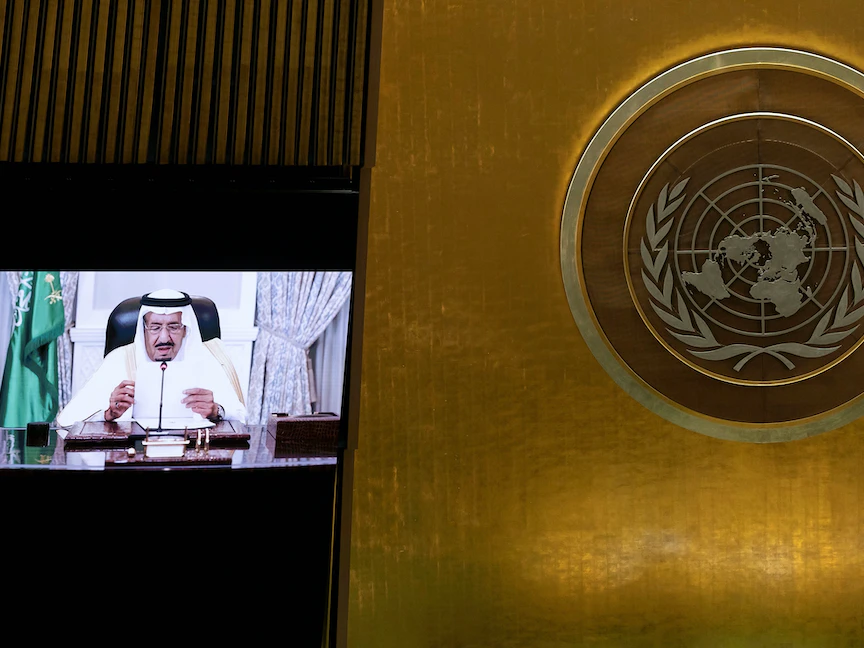 وأضاف الملك سلمان في كلمة مسجلة أمام الجمعية العامة للأمم المتحدة: أن بلاده "ملتزمة منذ توقيعها على ميثاق سان فرانسيسكو بمقاصدها ومبادئها، التي تهدف لحفظ الأمن والسلم الدوليين، وحل النزاعات سلمياً، واحترام السيادة والاستقلال، وعدم التدخل في الشؤون الداخلية للدول".