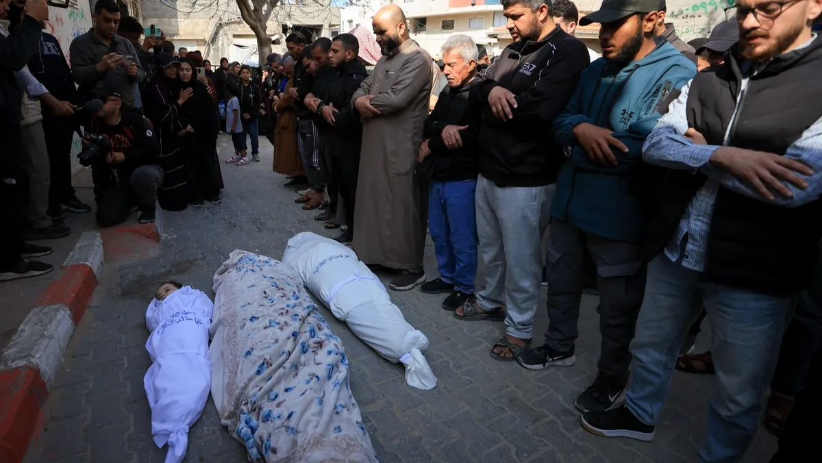 فلسطينيون يؤدون صلاة الجنازة على ضحايا غارة إسرائيلية على مدينة غزة. 25 أبريل 2026 - Reuters