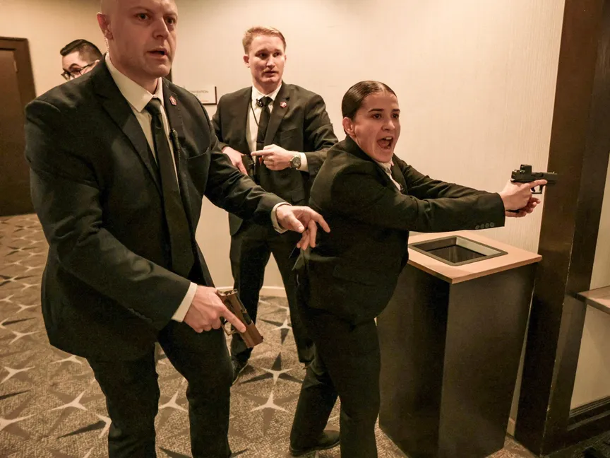 وبينما كان عملاء جهاز الخدمة السرية يتعاملون مع المشتبه به، اندلعت فوضى داخل القاعة بالفندق، حيث قفز ضباط يرتدون معدات تكتيكية ويحملون بنادق طويلة فوق الطاولات، ملوحين بأسلحتهم بينما أُخرج الرئيس وكبار الشخصيات الأخرى، مثل نائب الرئيس جي دي فانس، من على المسرح على عجل، بينما اختبأ الحاضرون الذين كانوا يرتدون بدلات رسمية وفساتين سهرة تحت طاولاتهم.