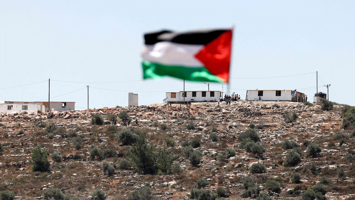 علم فلسطين يرفرف من أمام بؤرة استيطانية في قرية بيتا جنوب نابلس بالضفة الغربية- 18 يونيو 2021 - AFP