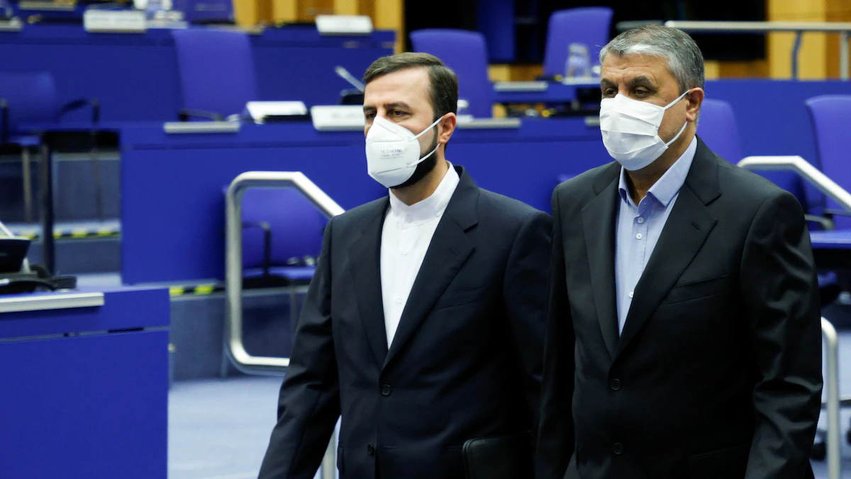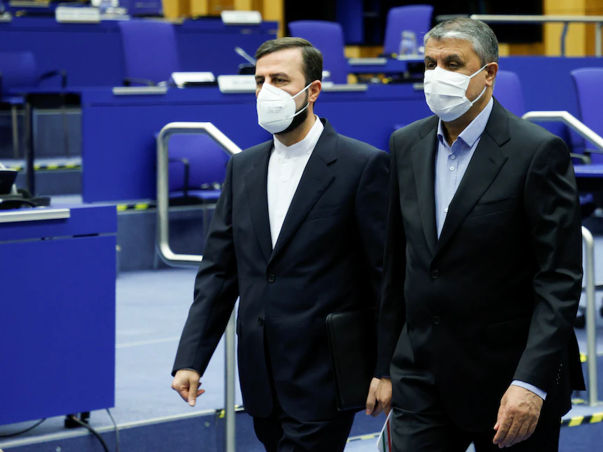 رئيس الوكالة الإيرانية للطاقة الذرية محمد إسلامي، وسفير إيران لدى الوكالة الدولية للطاقة الذرية كاظم غريب عبادي يصلان لحضور المؤتمر العام للوكالة الدولية للطاقة الذرية في فيينا  - 20 سبتمبر 2021 - REUTERS
