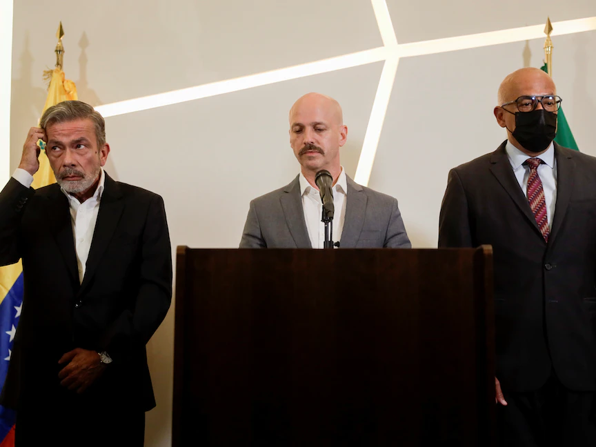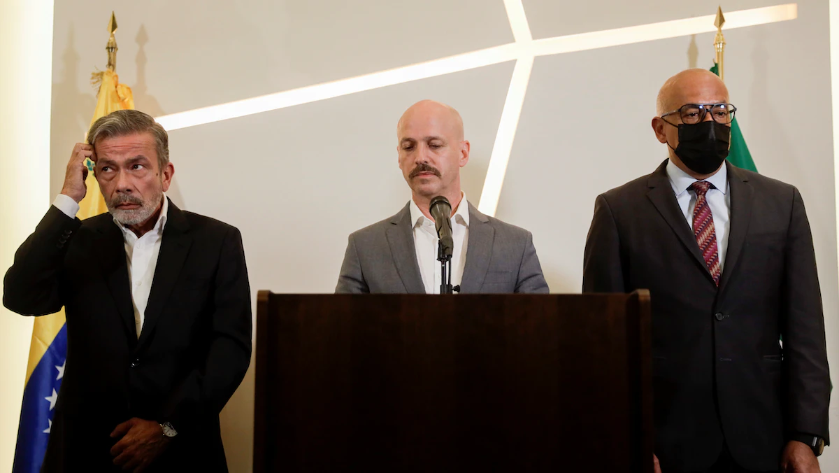 الوسيط النرويجي يتوسط رئيسي وفد التفاوض بين الحكومة الفنزويلة (يمين) والمعارضة (يسار) خلال المؤتمر الصحافي لمناسبة اختتام جولة المحادثات الاخيرة بين الطرفين في مدينة مكسيكو سيتي، 27 سبتمبر 2021 - REUTERS