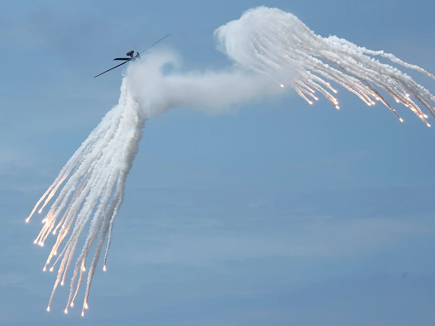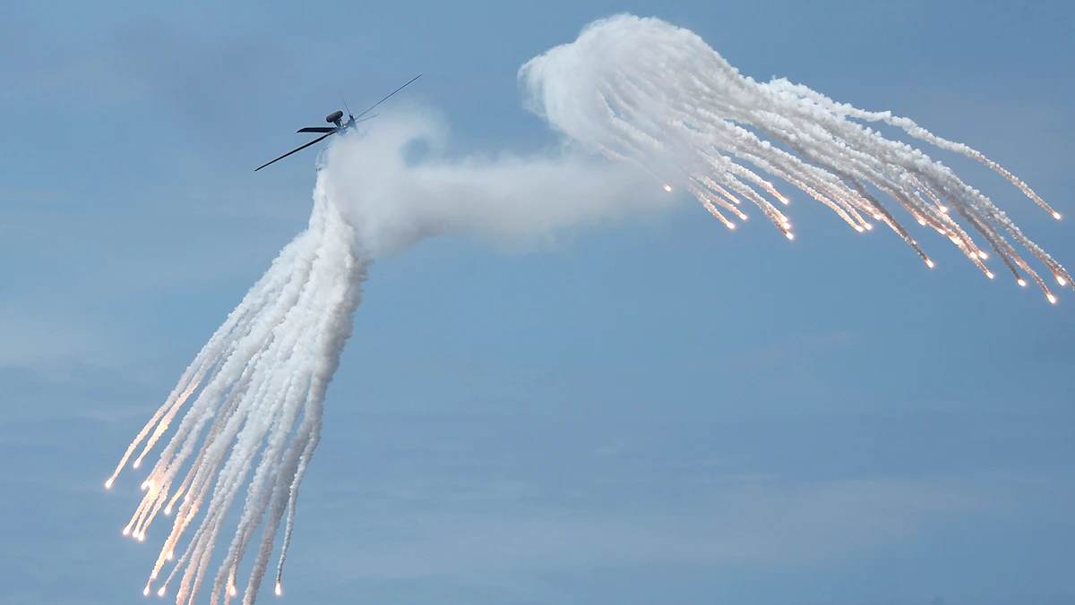 طائرة هليكوبتر هجومية من طراز AH-1W تطلق قنابل مضيئة خلال مناورة هان كوانغ العسكرية بالذخيرة الحية والتي تحاكي الجيش الصيني - REUTERS