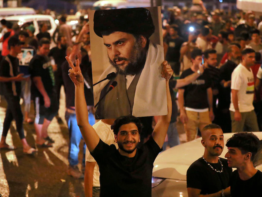 مؤيدون لمقتدى الصدر يحتفلون في بغداد بعد إعلان نتائج الانتخابات العراقية -11 أكتوبر 2021 - AFP