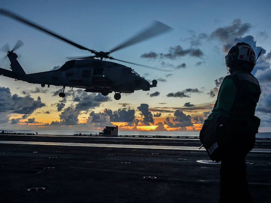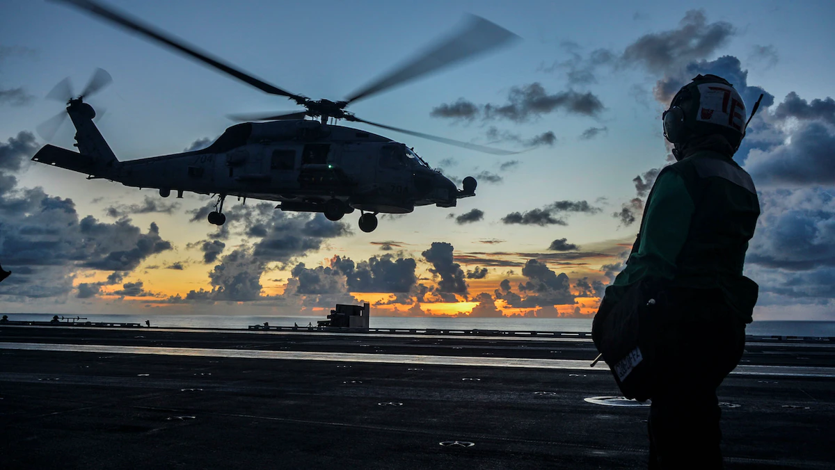 طائرة هليكوبتر تحلق فوق  حاملة الطائرات الأميركية "رونالد ريغن"في بحر الصين الجنوبي - 17 يوليو 2020 - via REUTERS