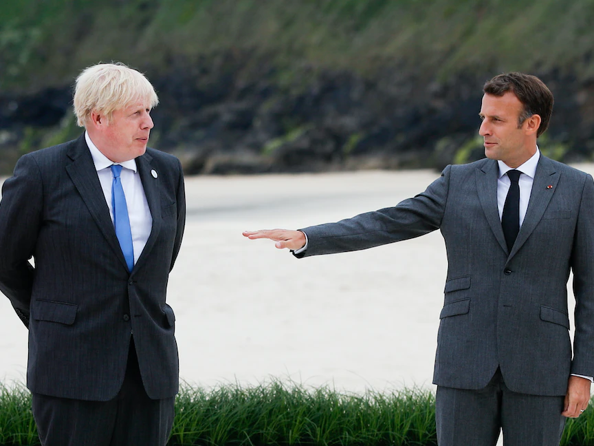 الرئيس الفرنسي إيمانويل ماكرون يلوح بجانب رئيس الوزراء البريطاني بوريس جونسون خلال قمة "مجموعة السبع" في كورنوال ببريطانيا -11 يونيو 2021 - REUTERS