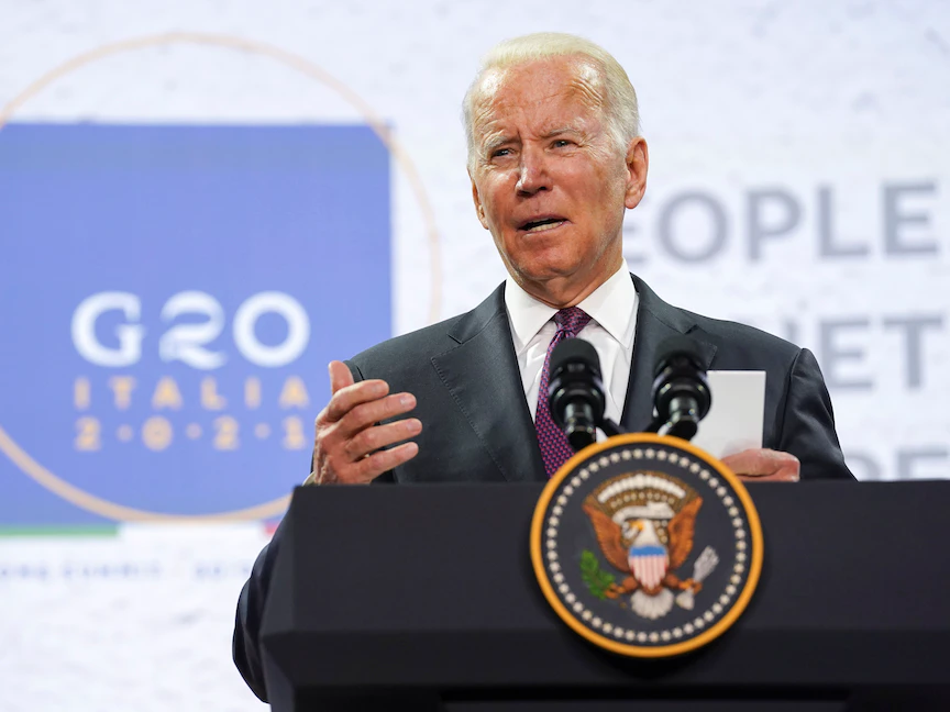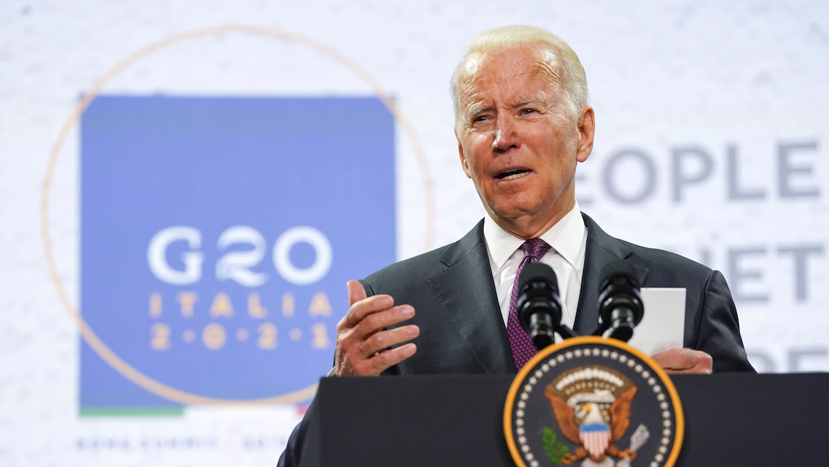 الرئيس الأميركي جو بايدن خلال مؤتمر صحافي في روما عقب قمة مجموعة العشرين، 31 أكتوبر 2021 - REUTERS