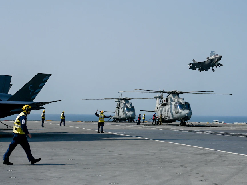 وبادرت الطائرات "إف ـ 35" البريطانية والأميركية، المصطفة على متن "كوين إليزابيث" لمنع الطائرات الروسية من التحليق فوقها، في أول مرة، إذ انطلقت المقاتلات وعلى متنها طيارون بريطانيون في البحر لاعتراض طائرات روسية، ثم مرافقتها.