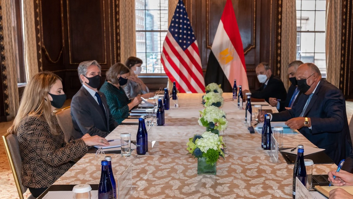 وزير الخارجية المصري سامح شكري ونظيره الأميركي أنطوني بلينكن على هامش الدورة الـ 76 للجمعية العامة للأمم المتحدة في نيويورك، 22 سبتمبر 2021 - Twitter@SecBlinken