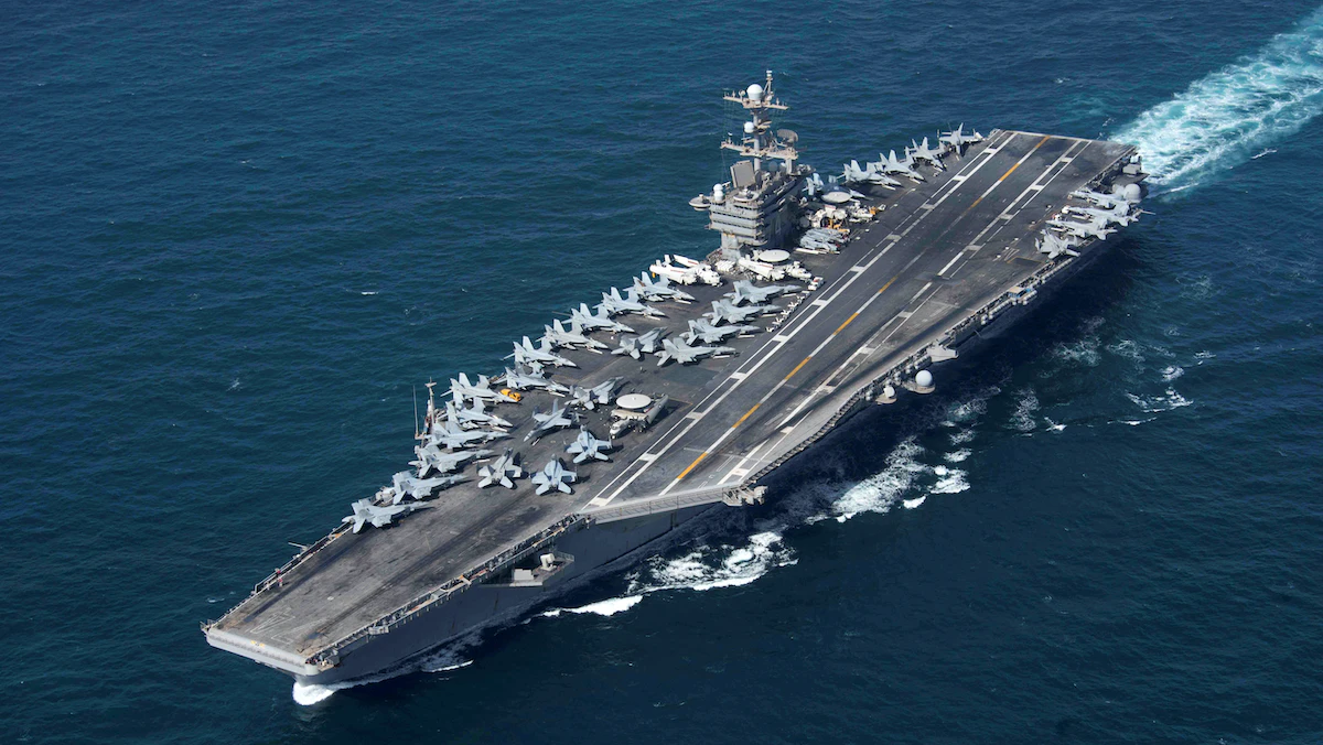 حاملة طائرات البحرية الأميركية "يو إس إس جون سي ستينيس" تعبر مضيق هرمز أثناء انتشارها في منطقة عمليات الأسطول الخامس الأميركي، 20 يناير 2019. - REUTERS