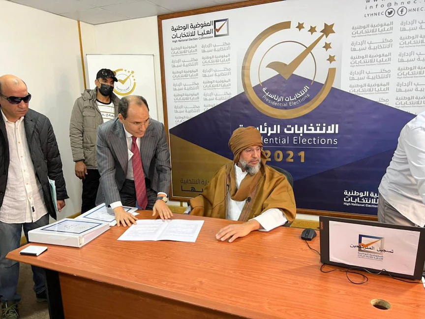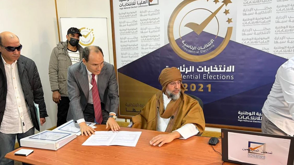 أعلنت المفوضية الوطنية العليا للانتخابات في ليبيا الأحد، أن سيف الإسلام القذافي تقدم بأوراق ترشحه للرئاسة، إلى مكتب الإدارة الانتخابية في سبها بجنوب البلاد.
