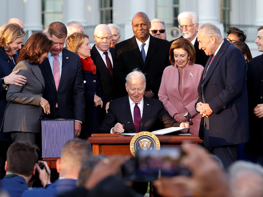 وقّع الرئيس الأميركي جو بايدن، الاثنين، في البيت الأبيض قانون خطّته الضخمة للبنى التحتية، التي تُعدّ أكبر مشروع استثماري من نوعه في الولايات المتحدة منذ أكثر من 50 عاماً، وذلك بعدما نال دعم الحزبين الديمقراطي والجمهوري.