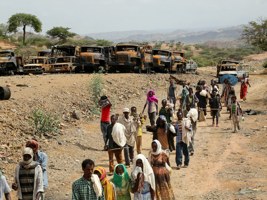 سكان من إقليم تيجراي يمشون أمام عشرات المركبات المحترقة، تيجراي، إثيوبيا، 10 يوليو 2021 - REUTERS