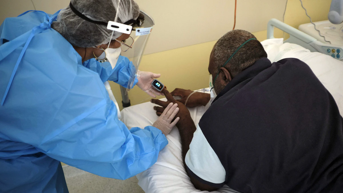 ممرضة تقيس تشبع الأكسجين لمريض يعاني من فيروس كوفيد -19 في مستشفى فرنسي. 30 سبتمبر 2021. - AFP