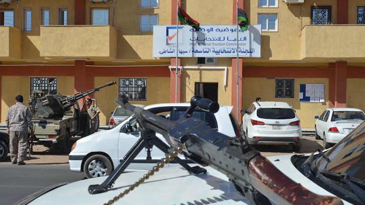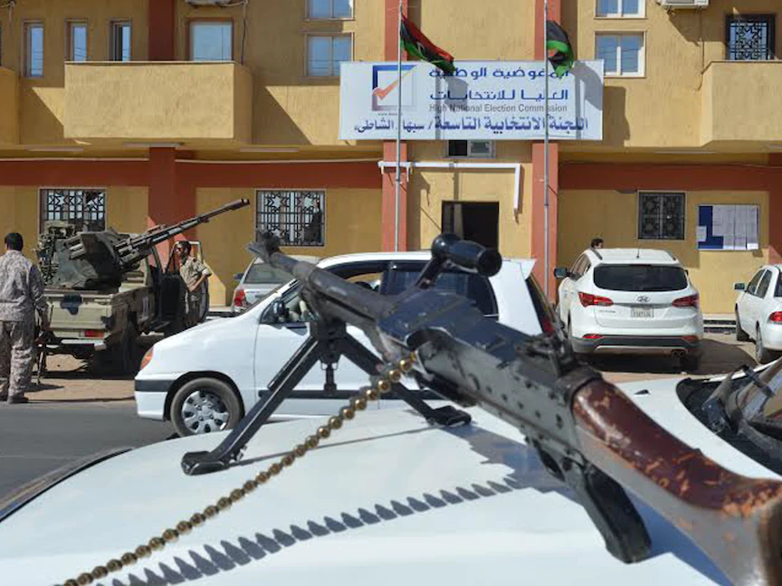 عناصر من الجيش أمام مركز اقتراع في مدينة سبها جنوب ليبيا، بعد تعرضه لهجوم من قبل مسلحين مجهولين عام 2014 - REUTERS