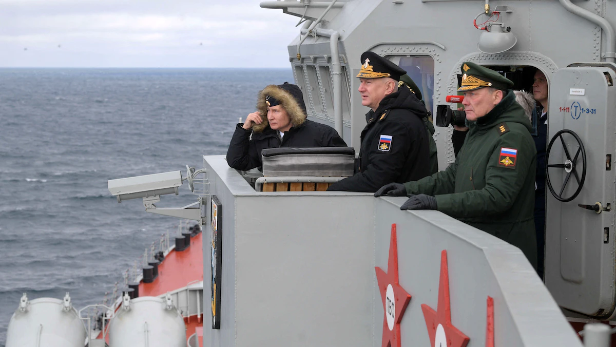 الرئيس الروسي فلاديمير بوتين يشاهد التدريبات المشتركة لأسطولي البحر الشمالي والأسود من على متن فرقاطة روسية في البحر الأسود قبالة سواحل القرم. 9 يناير 2020 - AFP