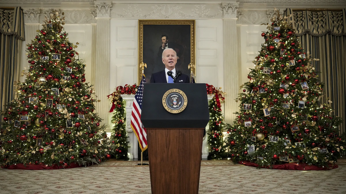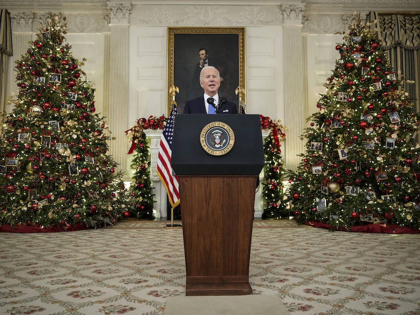 الرئيس الأميركي جو بايدن خلال إلقائه خطاباً في البيت الأبيض- 21 ديسمبر 2021 - AFP