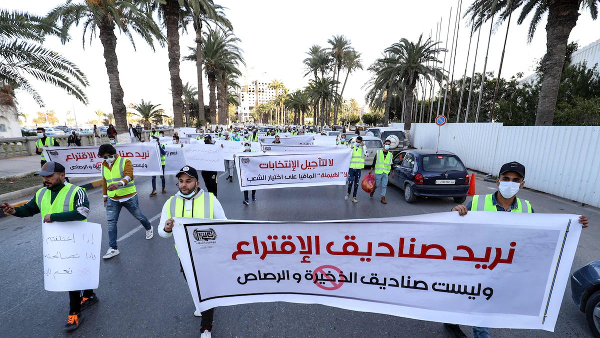 مجموعة من النشطاء الليبيين يحتجون على تأجيل الانتخابات الرئاسية في ساحة الشهداء بالعاصمة طرابلس، في 25 ديسمبر 2021. - AFP