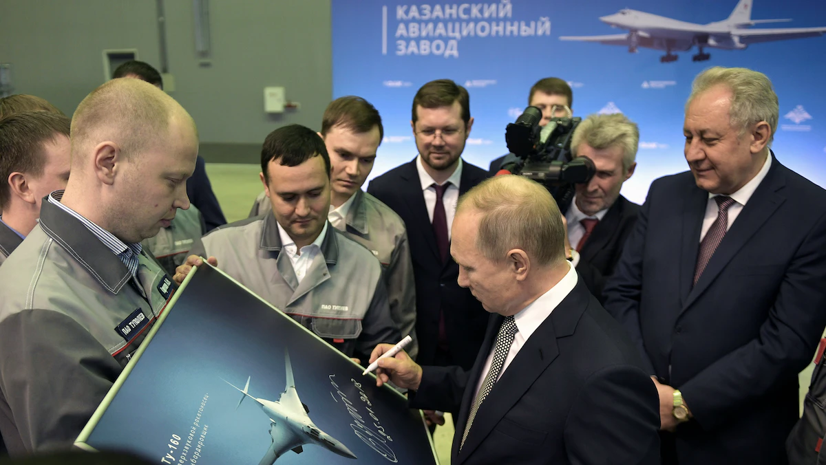 الرئيس الروسي فلاديمير بوتين يوقع على صورة قاذفة نووية من طراز TU-160M ​​خلال زيارة لمصنع جوربونوف للطيران في كازان، روسيا، 25 يناير 2018. - REUTERS