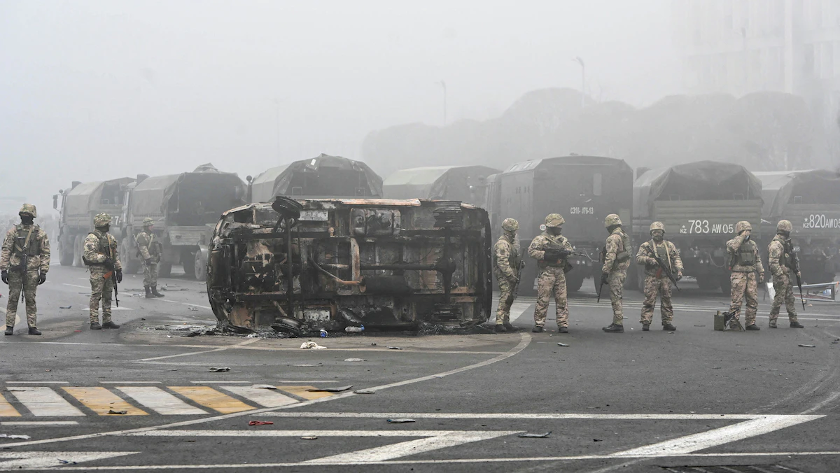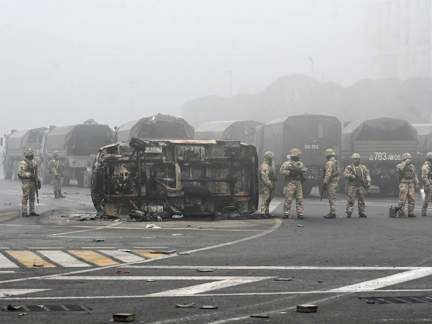 كانت كازاخستان، وهي منتج رئيسي للنفط تشترك في حدود طويلة مع كل من روسيا والصين، مستقرة بشكل ملحوظ لعقود. لكن في غضون أيام قليلة، تطورت مظاهرة صغيرة احتجاجاً على رفع أسعار الغاز الطبيعي المسال في منطقة نائية إلى "تمرد وطني" واضح، حيث اقتحم متظاهرون المباني الحكومية واستولوا لفترة وجيزة على مطار دولي، وذكرت تقارير محلية أن "عصابات إجرامية" استغلت الفوضى التي شملت أعمال تخريب ونهب واسعة النطاق في ألما آتا.