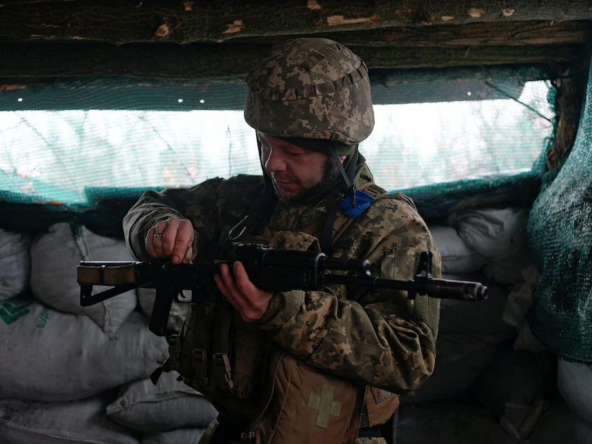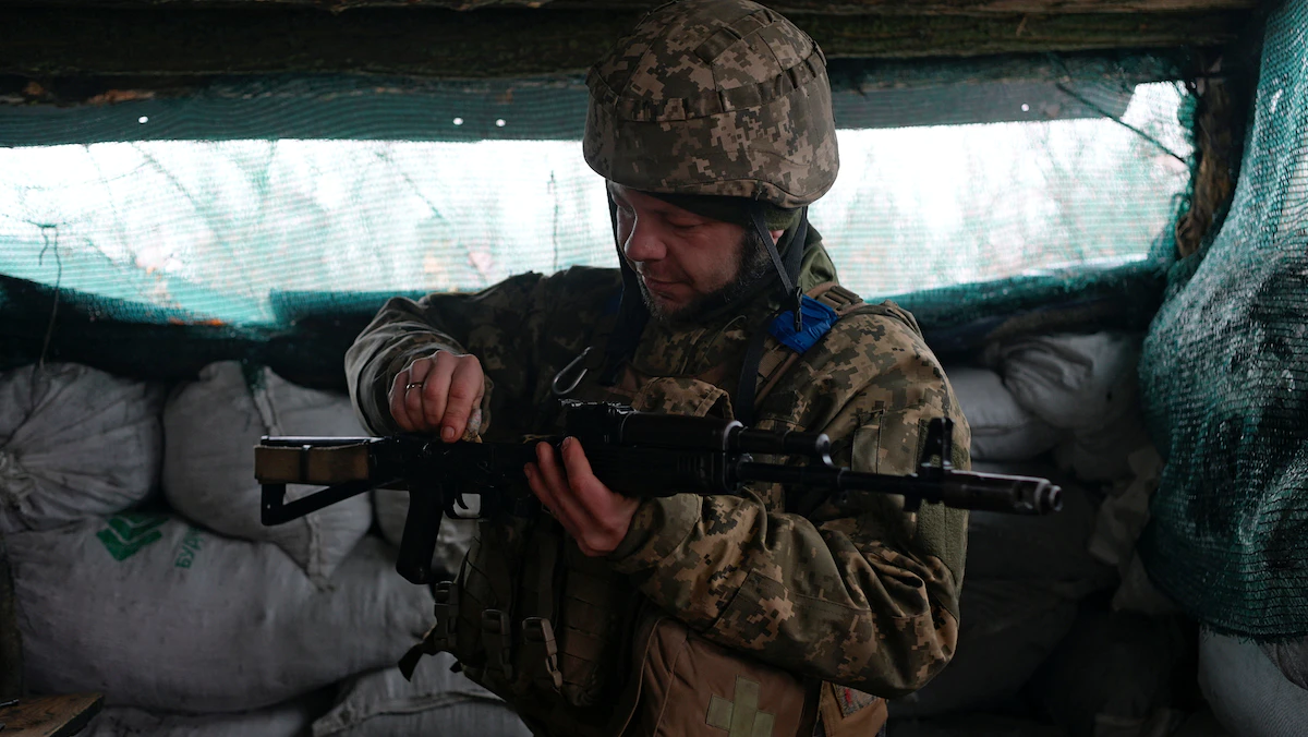 جندي أوكراني على خط المواجهة مع القوات الروسية المحتشدة على الحدود بين البلدين، 6 يناير 2022 - REUTERS