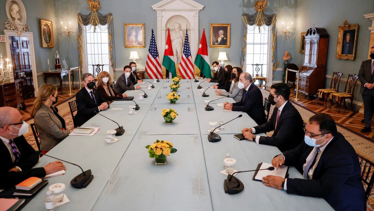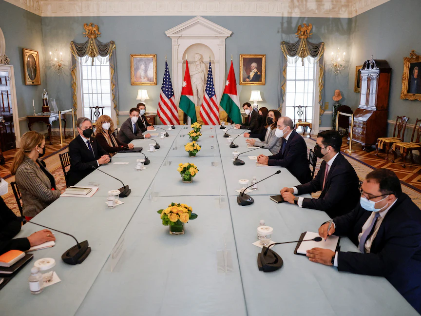 وزير الخارجية الأردني أيمن الصفدي خلال لقائه وزير الخارجية الأميركي أنتوني بلينكن في واشنطن العاصمة، في 13 يناير 2022 - REUTERS