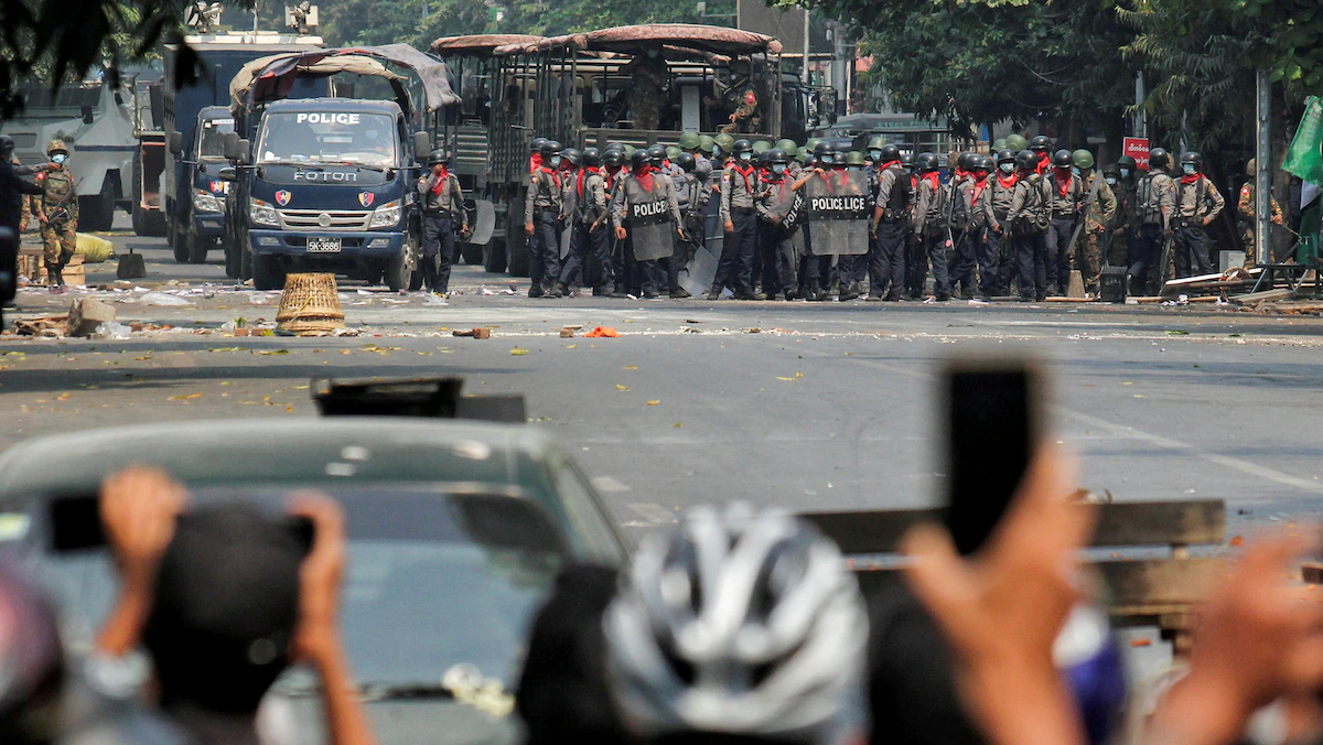 شرطيون خلال تظاهرة مناهضة للانقلاب في مدينة ماندالاي بميانمار - 3 مارس 2021 - REUTERS