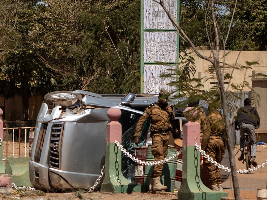 عناصر الجيش في بوركينافاسو يسيرون بجانب سيارة مدمرة، في معسكر واجادوجو-  24 يناير 2022. - AFP