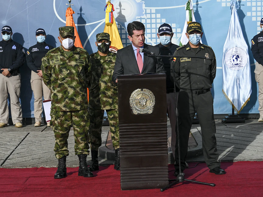 وزير الدفاع الكولومبي دييغو مولانو خلال مؤتمر صحافي في بوغوتا. يوليو 2021 - AFP