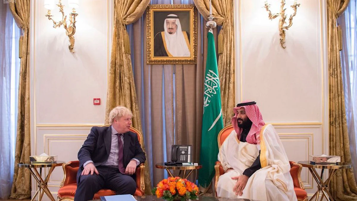 ولي العهد السعودي الأمير محمد بن سلمان خلال لقاء رئيس الوزراء البريطاني (وزير الخارجية حينها) بوريس جونسون في لندن- 19 مارس 2018