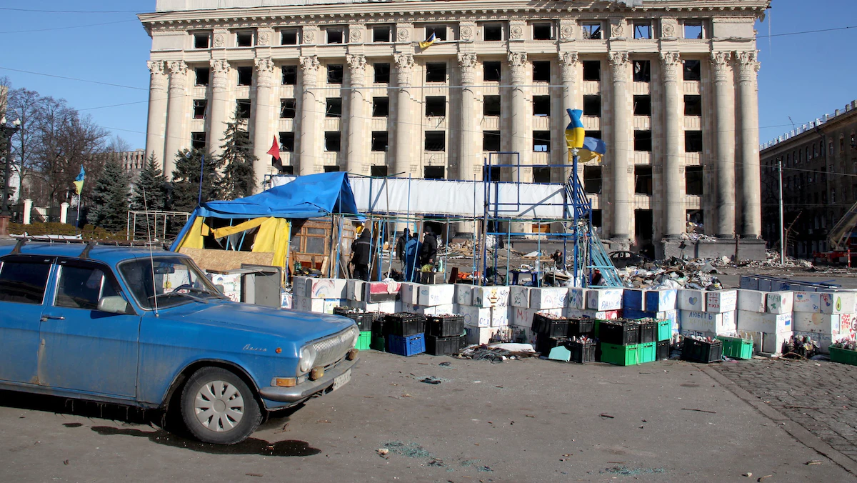 متطوعون يقدمون المساعدة الإنسانية في ميدان الحرية بمدينة خاركوف الأوكرانية - 18 مارس 2022 - REUTERS