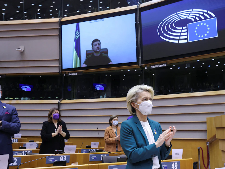 وفرضت الدول الـ27 الأعضاء بالاتحاد سلسلة من العقوبات مست الاقتصاد الروسي. كما وافقت على تمويل شراء أسلحة للقوات الأوكرانية بقيمة مليار يورو.