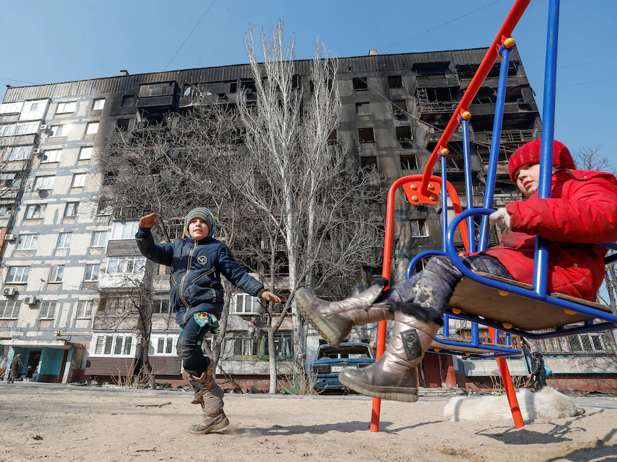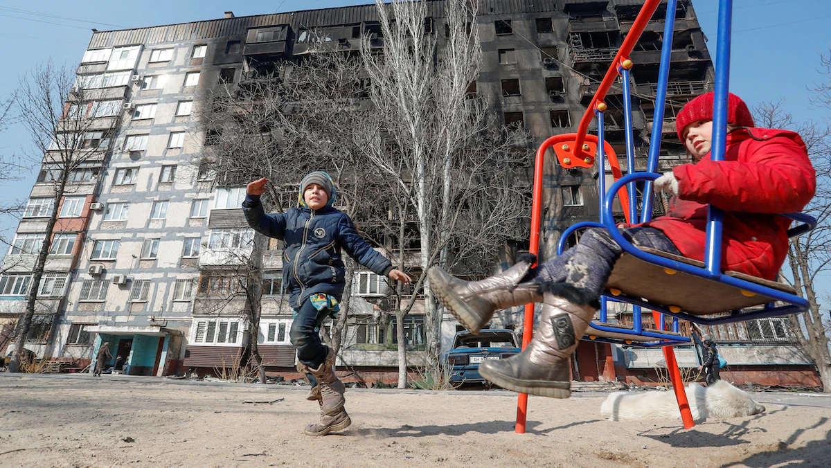 أطفال يلعبون أمام مبنى مدمر في مدينة ماريوبل المحاصرة من القوات الروسية جنوبي أوكرانيا - 23 مارس 2022 - REUTERS