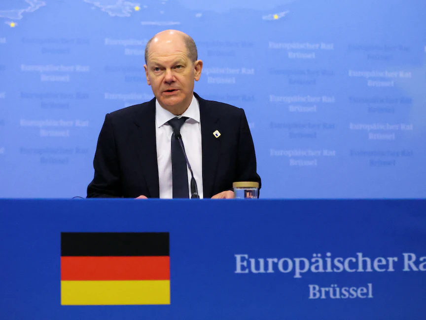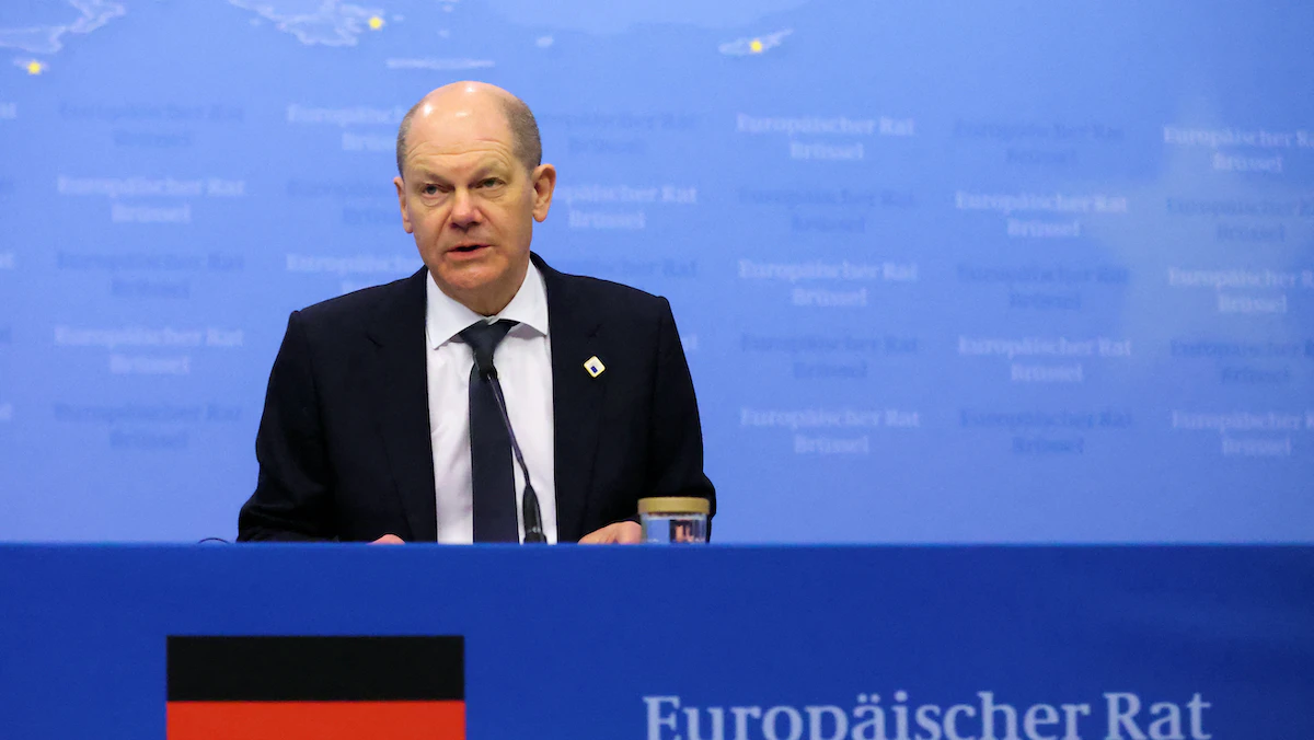 المستشار الألماني أولاف شولتز يتحدث بعد قمة زعماء الاتحاد الأوروبي في بروكسل- 25 مارس 2022 - REUTERS
