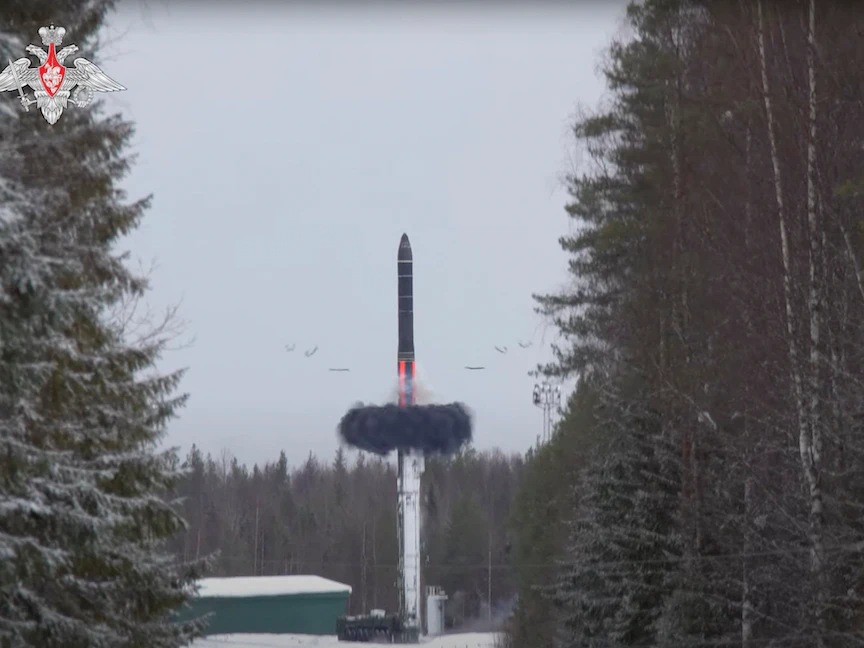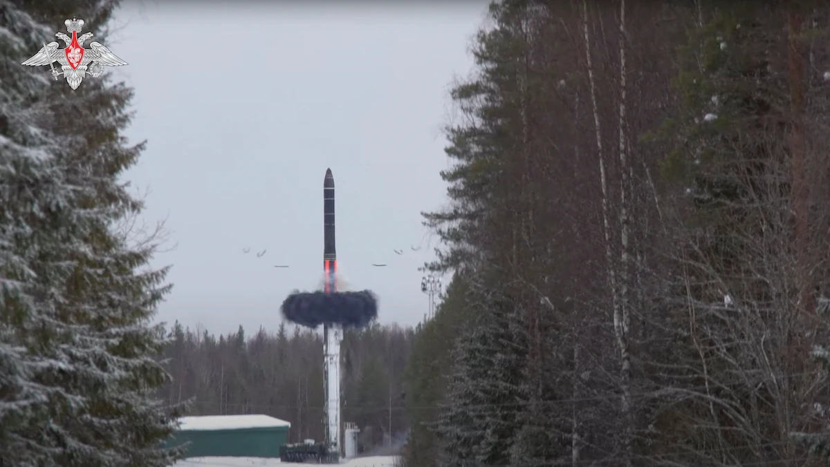إطلاق صاروخ باليستي روسي عابر للقارات خلال تدريبات للقوات النووية في مكان مجهول في روسيا. 19 فبراير 2022. - REUTERS