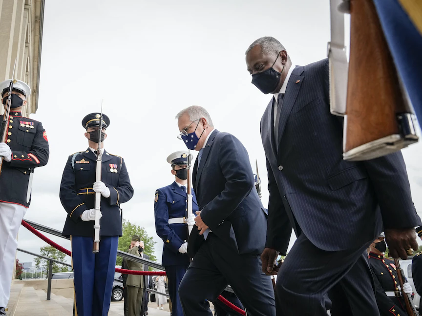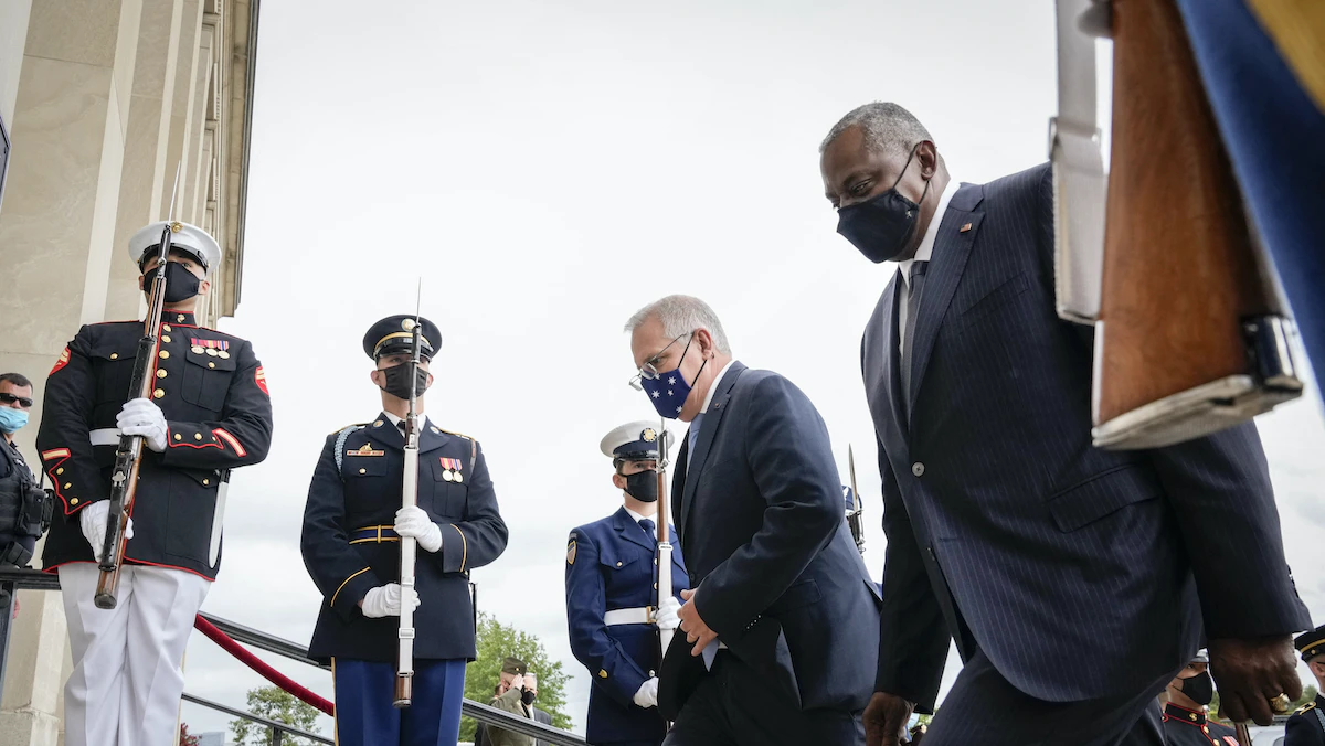 وفي شأن آخر، قال بيان تحالف "أوكس" إنه "في ضوء الغزو الروسي غير المبرر وغير القانوني لأوكرانيا، جددنا التزامنا الراسخ بنظام دولي يحترم حقوق الإنسان، وسيادة القانون، والحل السلمي للنزاعات دون إكراه".