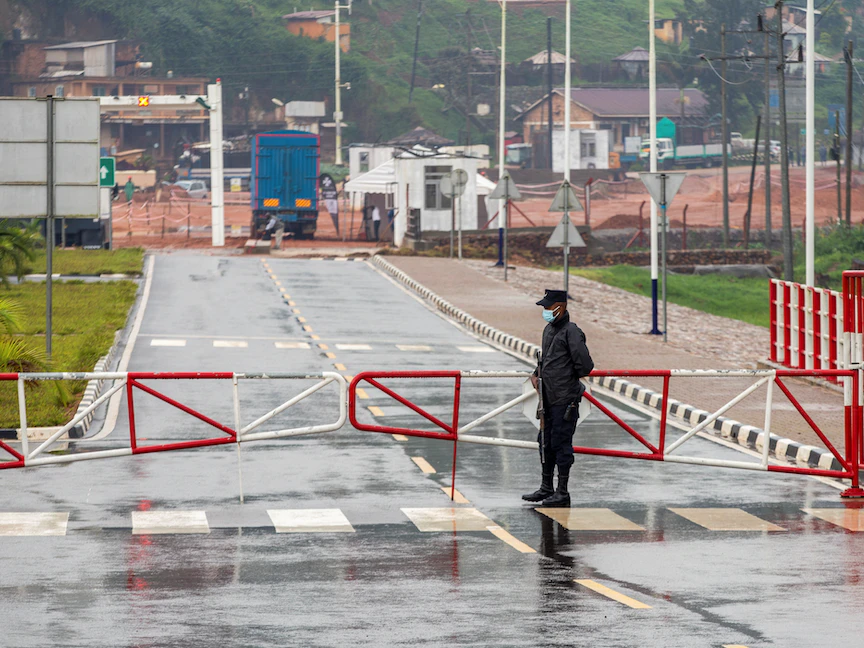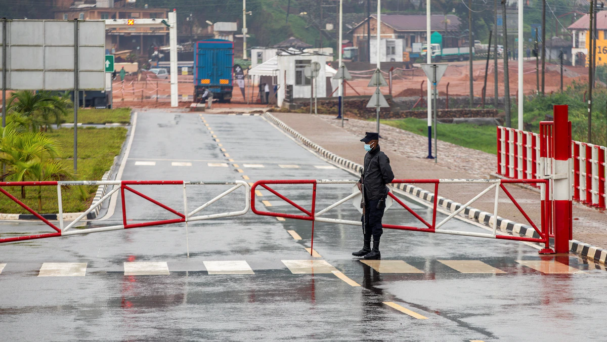 ضابط شرطة رواندي يقف حارساً عند حاجز نقطة حدودية واحدة في جاتونا في جيكومبي، شمال رواندا - 31 يناير 2022 - REUTERS