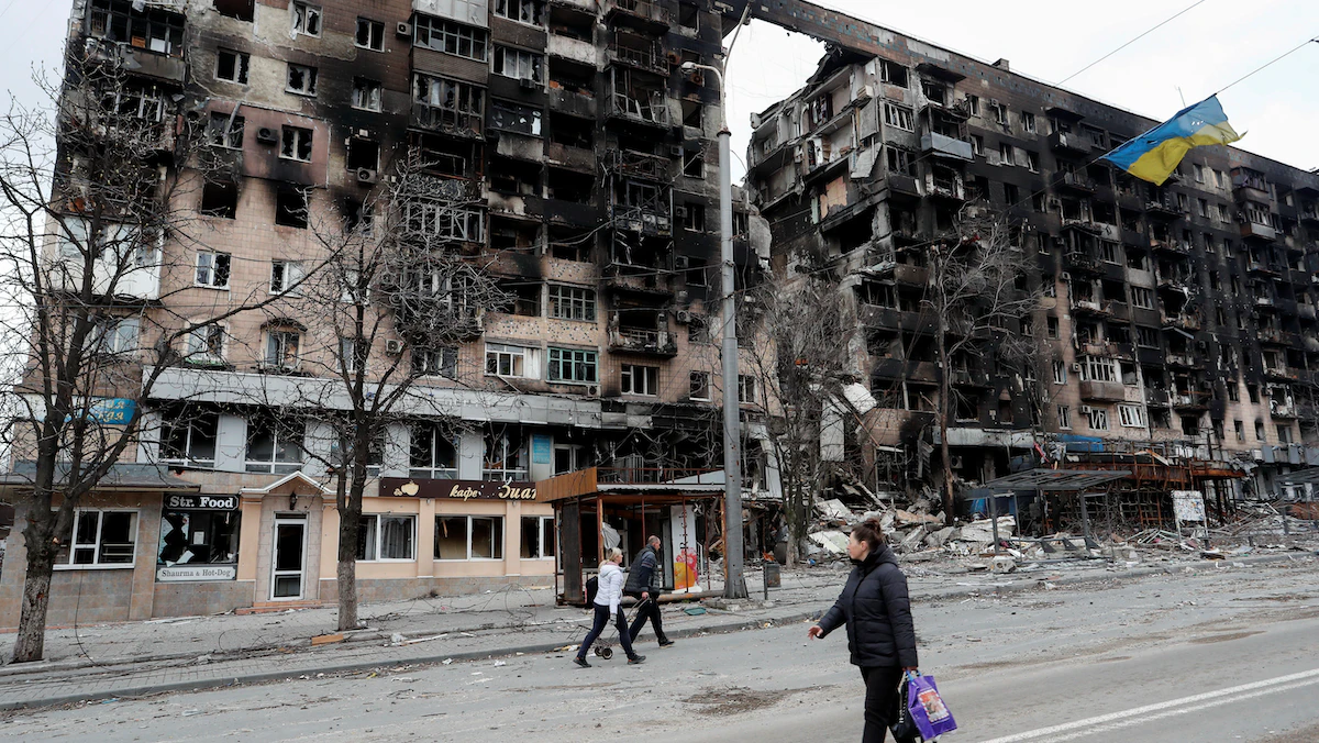 أشخاص يسيرون على طول شارع بالقرب من علم أوكرانيا معلق على سلك أمام مبنى سكني دمر خلال الصراع بين أوكرانيا وروسيا، في مدينة ماريوبل، أوكرانيا. 14 أبريل 2022 - REUTERS