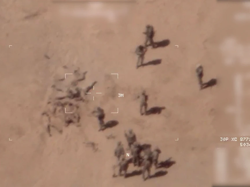 ويُظهر الفيديو الذي صوّره الجيش الفرنسي بطائرة مسيرة واطلعت عليه وكالة "فرانس برس"، مساء الخميس، جنوداً منشغلين حول جثث يغطّونها برمال.