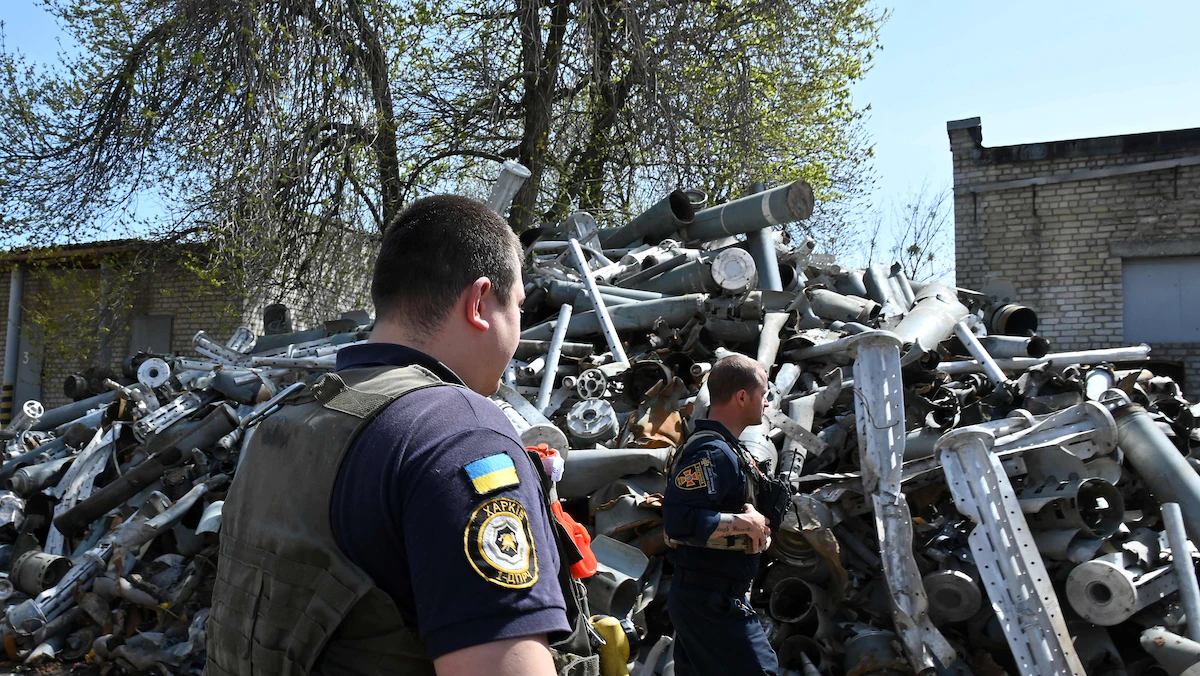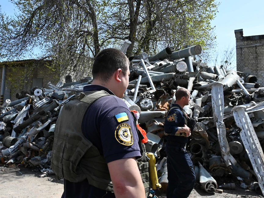 أفراد من خدمة الطوارئ الحكومية يقفون أمام كومة من الصواريخ تم جمعها بعد قصف روسي لمدينة خاركوف، أوكرانيا - 25 أبريل 2022 - AFP
