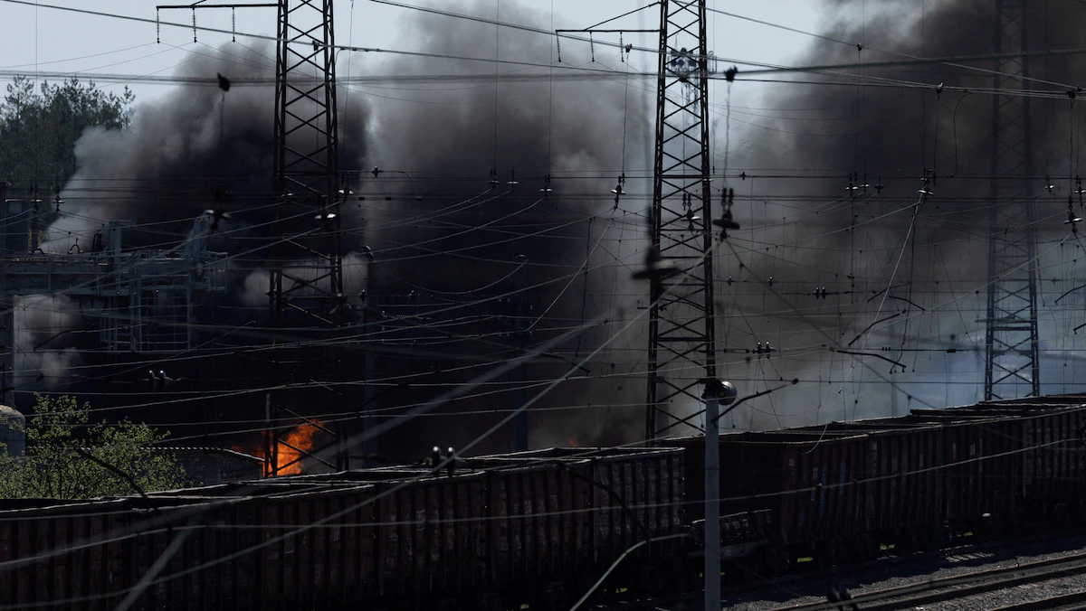 دخان يتصاعد بعد غارة على منشأة بالقرب من محطة سكة حديدية في مدينة ليمان الواقعة على خط المواجهة في منطقة دونيتسك بشرق أوكرانيا - 28 أبريل 2022 - REUTERS