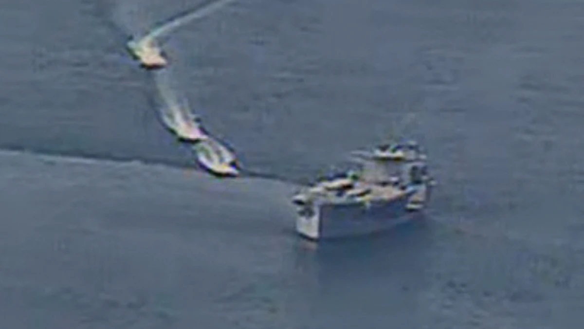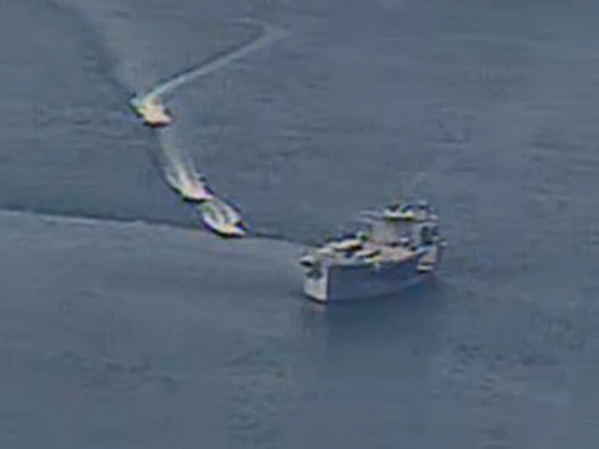 سفن من سلاح البحرية التابع لـ"الحرس الثوري" الإيراني تقترب من سفن عسكرية أميركية أثناء عملها في المياه الدولية شمال الخليج العربي 15 أبريل 2020 - AFP