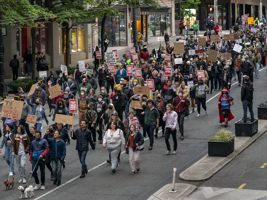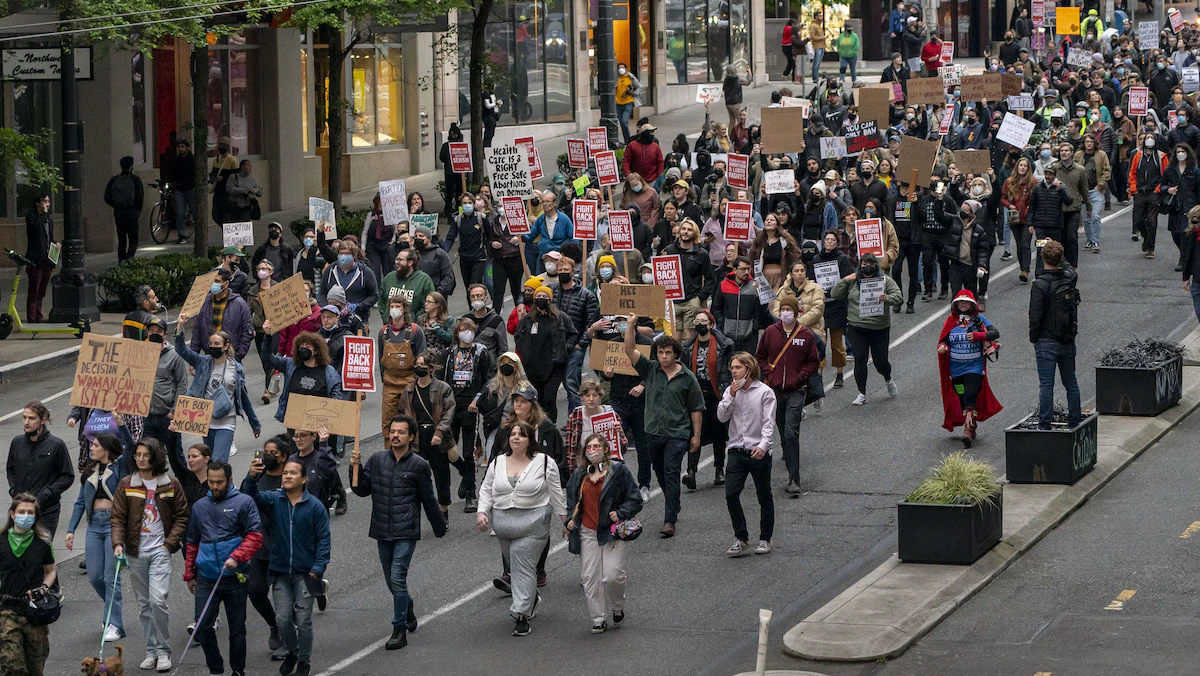متظاهرون يحتجون ضد مشروع قرار للمحكمة العليا الأميركية يُقيِّد الإجهاض في الولايات المتحدة، كاليفورنيا– 3 مايو 2022 - AFP