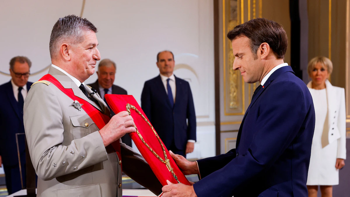 وأعلن رئيس المجلس الدستوري لوران فابيوس فوز ماكرون في الدورة الثانية التي جرت في 24 أبريل الماضي، أمام مرشحة اليمين المتطرف مارين لوبن بحصوله على 58.55% من الأصوات؛ ومن ثم قُلد قلادة جوقة الشرف.