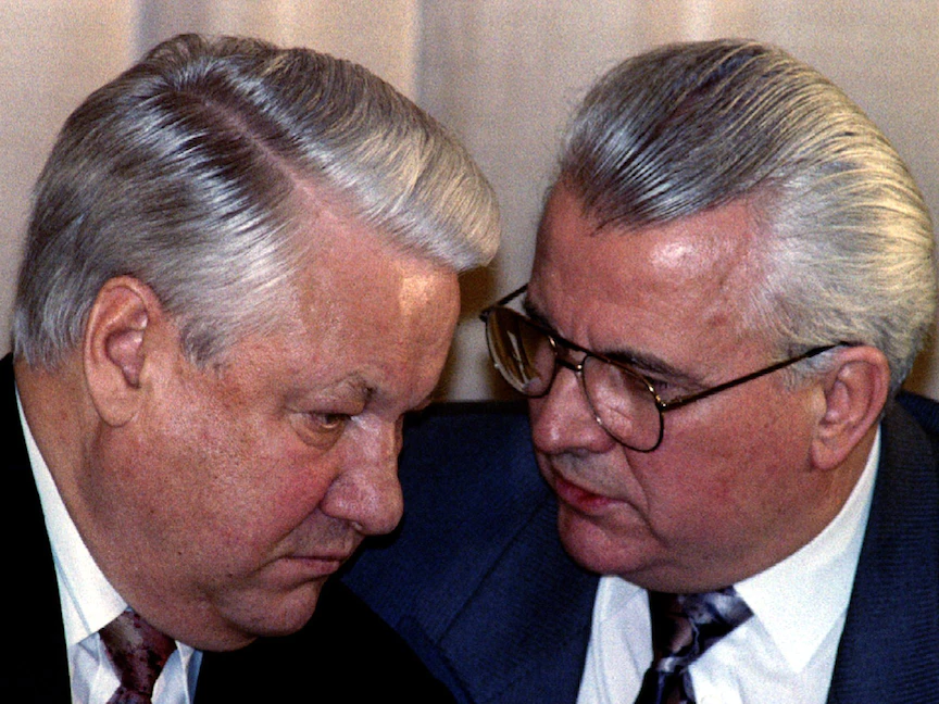 الرئيسان الراحلان الروسي بوريس يلتسين (إلى اليسار) والأوكراني ليونيد كرافتشوك في صورة جمعتهما خلال قمة رابطة الدول المستقلة في مينسك ببيلاروسيا - 16 أبريل 1993 - REUTERS