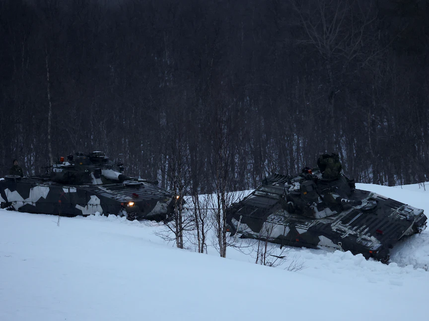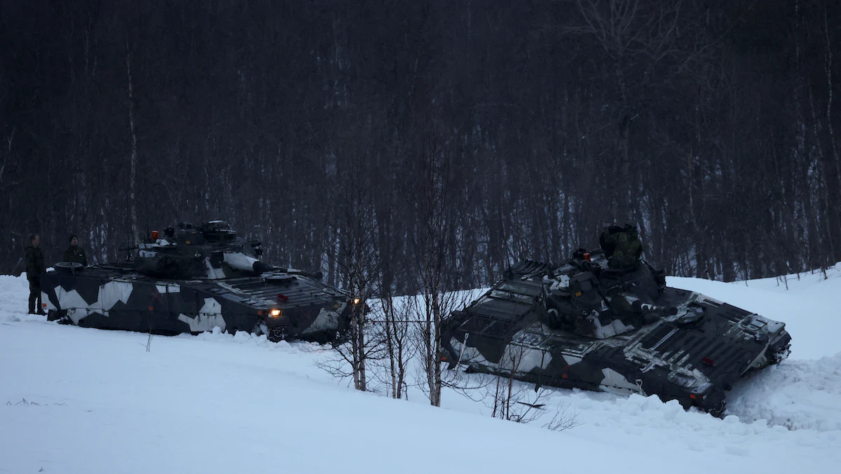 مركبات قتال للجيش السويدي خلال تدريبات عسكرية مسماة "الاستجابة الباردة 2022" بالشراكة مع حلف الناتو في النرويج - 25 مارس 2022 . - REUTERS