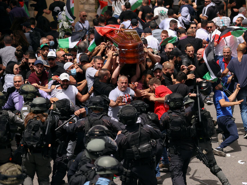 وأظهرت لقطات تلفزيونية من موكب الجنازة القوات الإسرائيلية وهي تستخدم القنابل الصوتية على حشد في حي الشيخ جراح بالقدس الشرقية، فضلاً عن استخدام الهراوات في ضرب المشيعين الفلسطينيين الذين كانوا يحملون نعش الصحافية الراحلة.