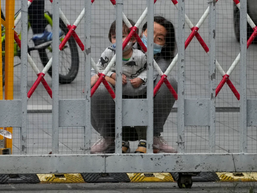 امرأة وطفل ينظران من وراء حاجز حديدي في منطقة سكنية مغلقة بشنغهاي - 10 مايو 2022 - REUTERS